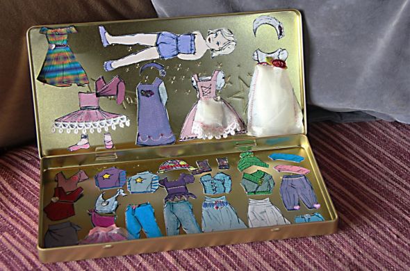 Erst habe ich eine kleine Figur mit verschiedener Kleidung gezeichnet und digitalisiert und dann auf einer Magnetfolie ausgedruckt. Der Spaß geht los, wenn alles ausgeschnitten ist. Nach Lust und Laune die Kleidungsstücke mit Zierstichen und Glitzerkram versehen. Weil die Stücke auf Magnetfolie (gibt es extra für Tintenstrahldrucker zu kaufen) gedruckt sind haften sie an Metall und die Puppe kann ohne Probleme immer wieder mit neuen schicken Outfits ausgestattet werden.