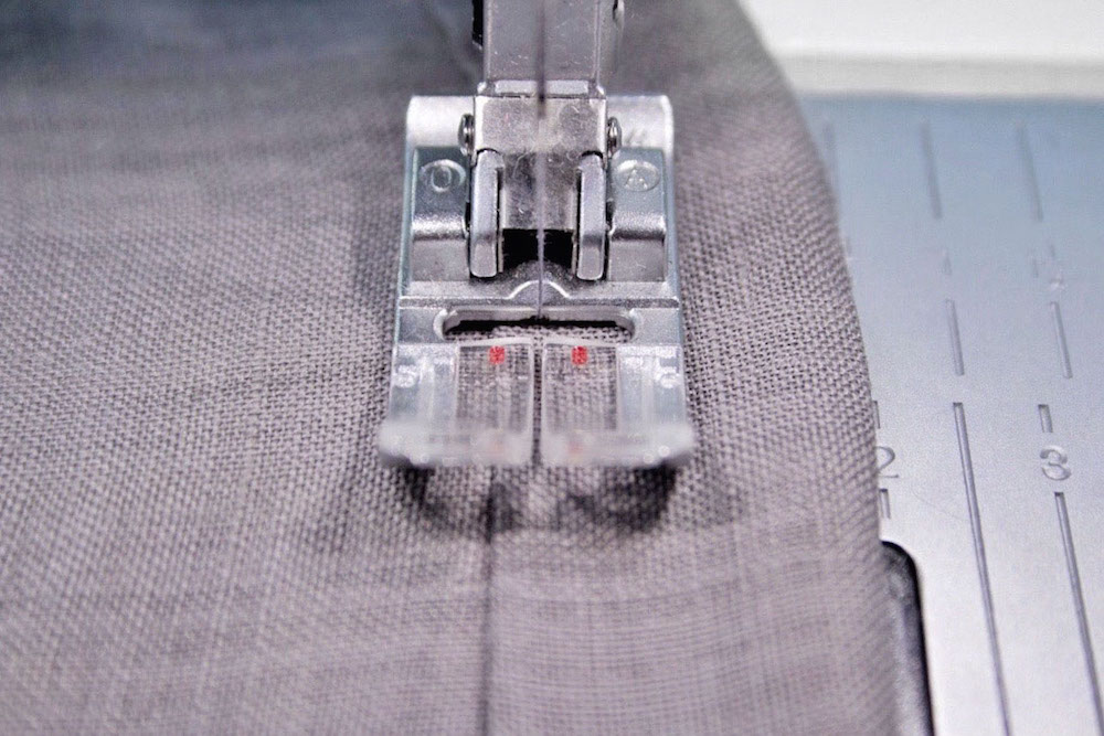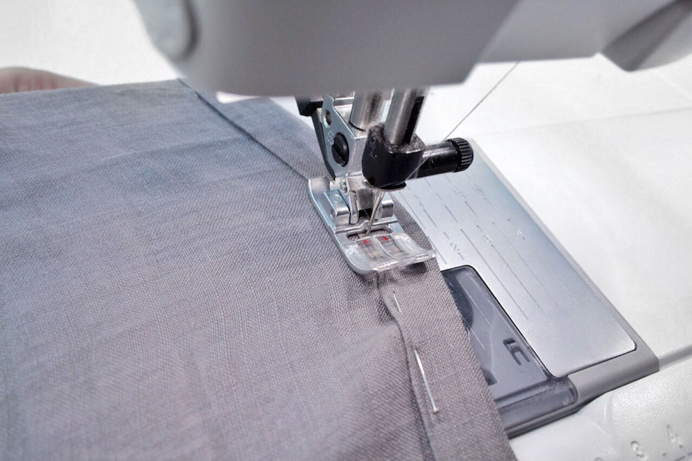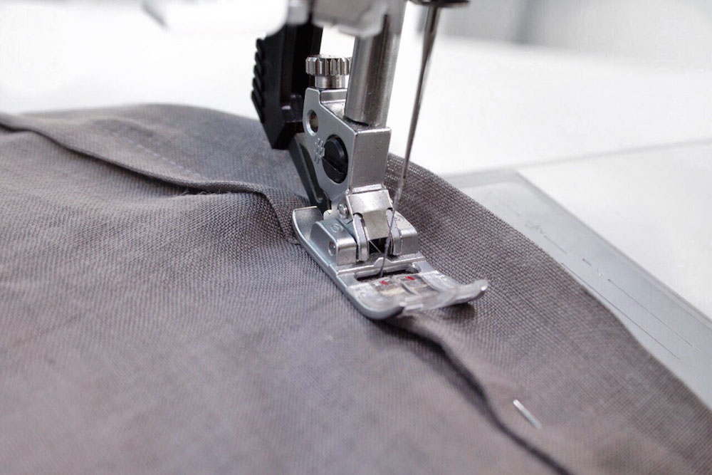 4. Fixiere die gebügelte Kante mit Stecknadeln und steppe den Saum bei 0,5 cm zu. Beim Nähen stelle ich fast immer das IDT System an damit der Stoff nicht verrutscht.