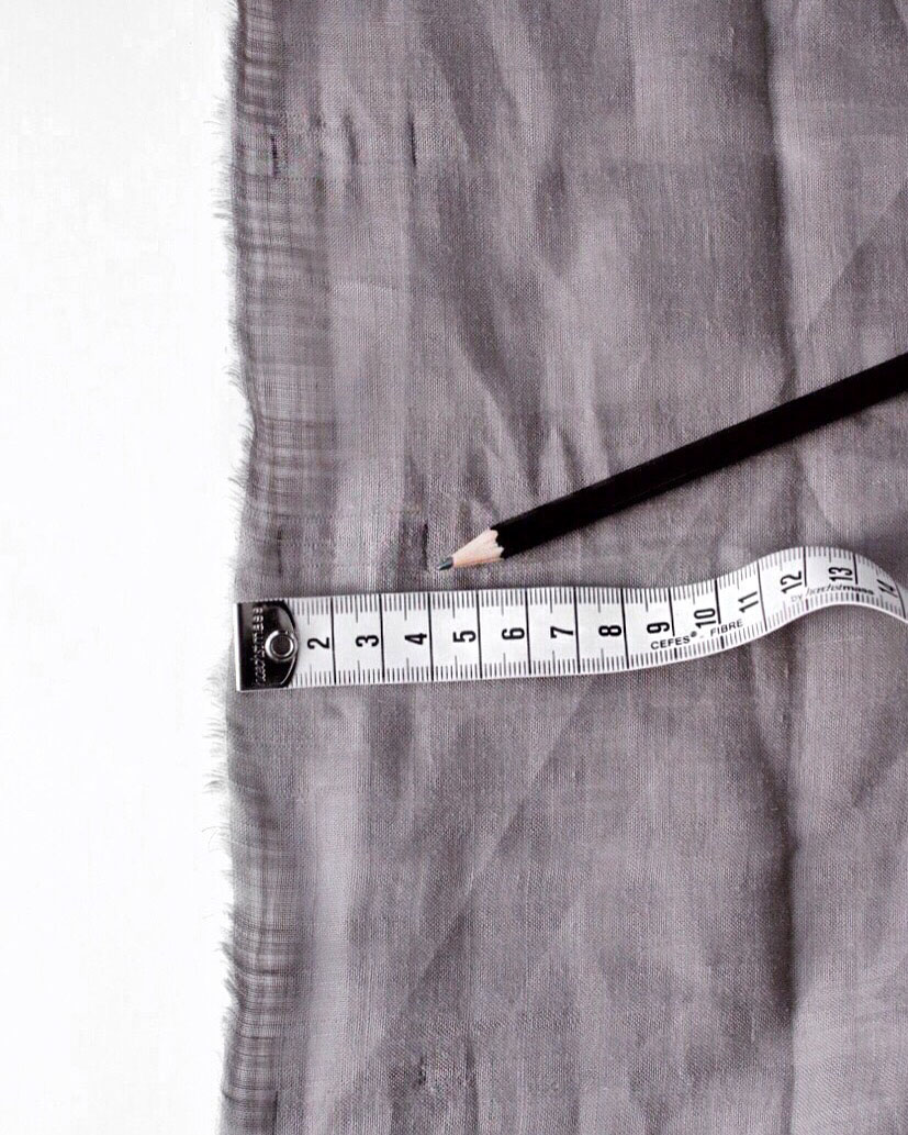 2. Falte den Stoff mit der rechten Seite nach oben auf einem Tisch aus und leg das Maßband an die Seite des Stoffes, wo später der Gummizug sein soll. Mache erst bei 1 cm und dann bei 4 cm einen Strich. Mach dir am besten an der ganzen Länge Markierungen, so dass du jetzt ganz genau weißt wo du den Stoff umbügeln musst.