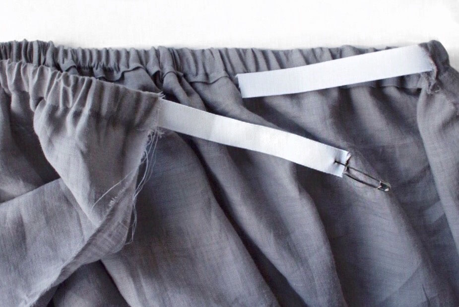 11. Wiederhole alle Schritte mit dem kleinen Teil. Wenn du das kleine Teil auch fertig hast, fixiere beide hintere Mitten und vordere Mitten am Gummizug mit je einer Stecknadel. Nähe die Stellen mit ein paar Stichen zusammen. Und fertig ist das Kleid!