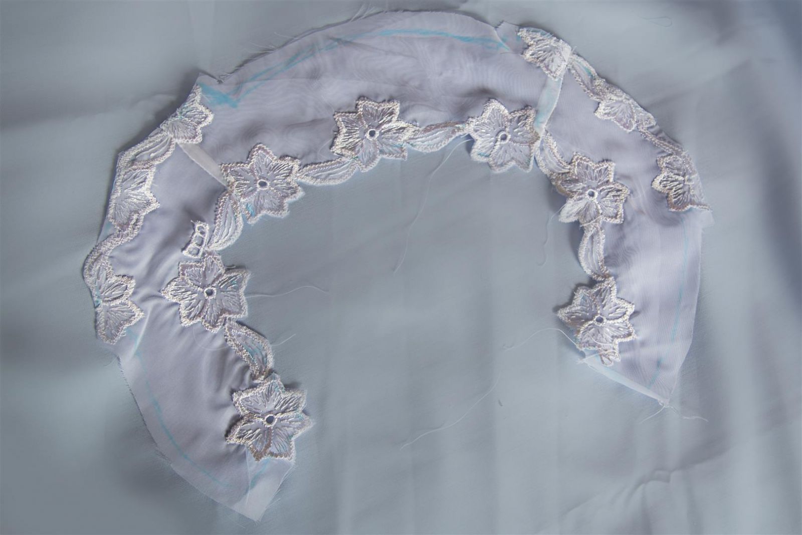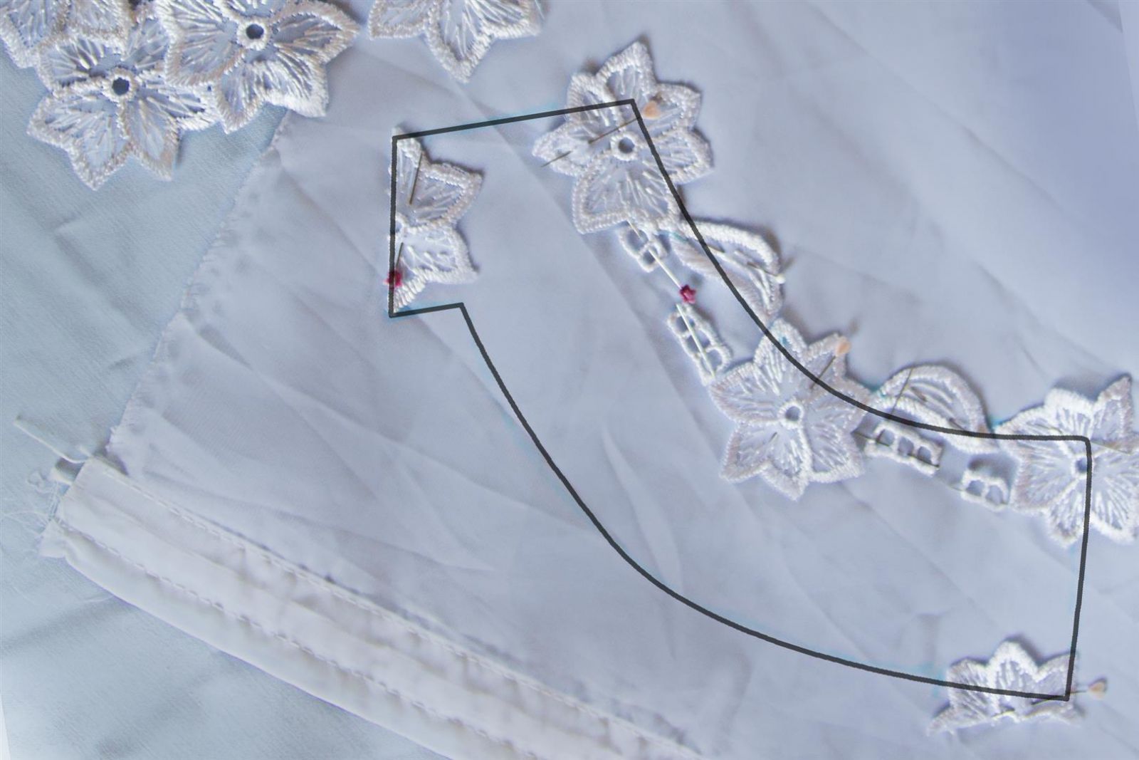 Hier habe ich die Einzelteile aus einer Gardine ausgeschnitten und in Kragenform wieder im Zickzackstich aufgenäht.