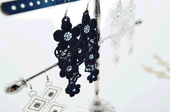 - Nehmen Sie nach Abschluss der Stickerei das Vlies aus dem Stickrahmen. Schneiden Sie überschüssige Vlies ab und weichen Sie die Ohrringe in lauwarmem Wasser ein, bis sich das Vlies aufgelöst hat.
