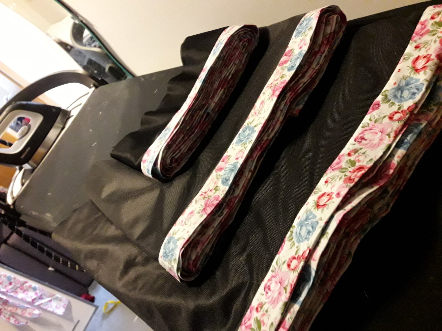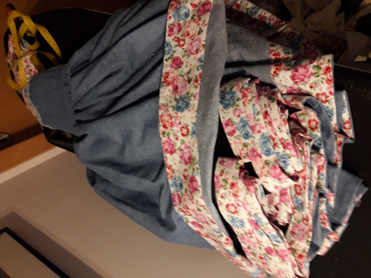 Die Unterröcke sind mit etwa 22m Schrägband verziert - alle aus eine Stück Blümchenstoffgeschnitten.