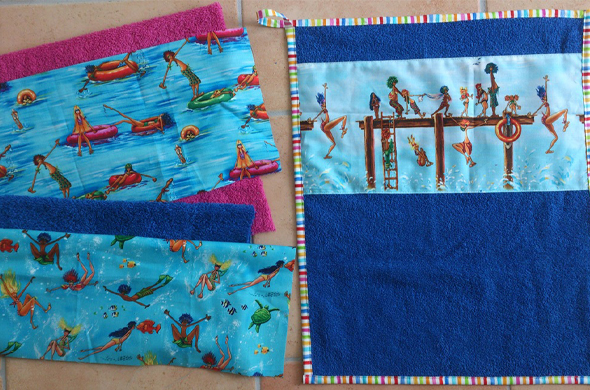 Die künstlerischen Figuren auf dem Stoff sind ganz im Sommerlook und haben richtigen Sommerspaß. Aber Achtung: Gut festhalten - das Tuch ist ein Unikat - Gästetuch Summertime - Schnitt und Stoffe gibts im Nähparadies in Bruchköbel!