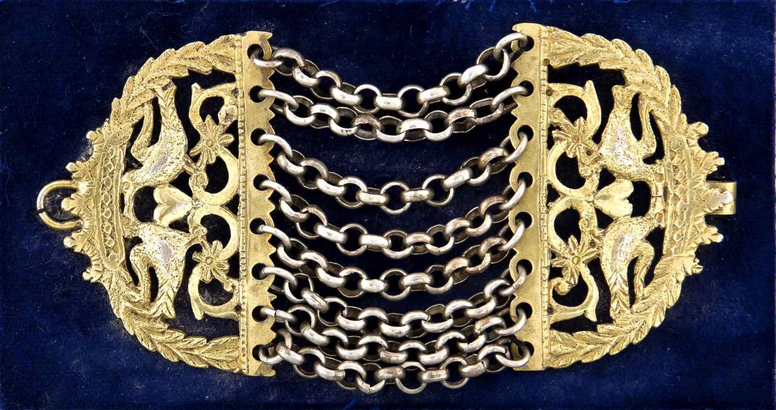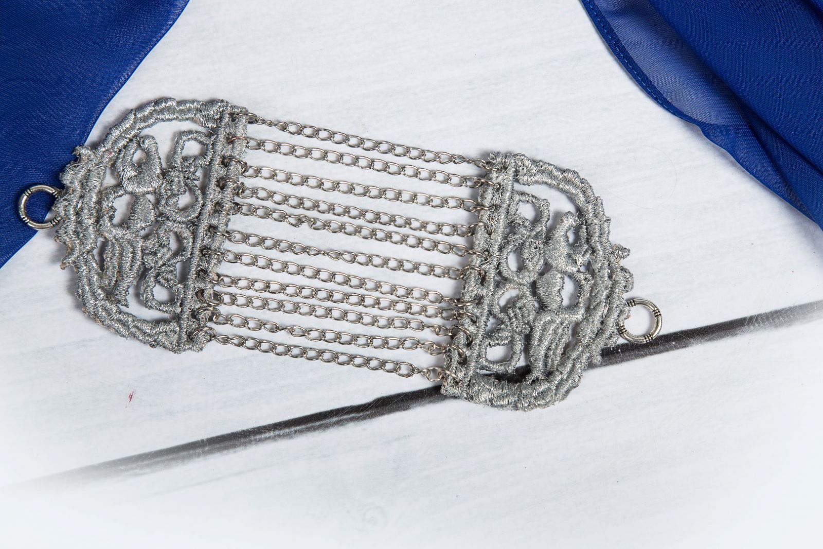 Der Schmuck der Vierländerin war aufgrund der reichen Region und des fruchtbaren Bodens sehr üppig. Die Brustkette oder Schillerkeed, die ich hier als „Flitterkram“ nachgestickt habe, bekam eine Vierländerin zur Verlobung mit ihrem Zukünftigen. Die Initialen von beiden wurden eingearbeitet und waren so etwa wie ein Ehering. Die Motive waren darum wohl oft auch Turteltauben. Irgendwie romantisch. Ich habe aber auch schon gehört, dass diese Tauben den Heiligen Geist darstellen sollen.