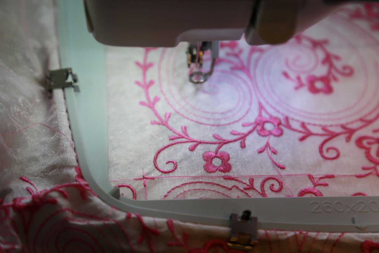 Du hast ganz recht ich habe auf Organza gestickt. Das würde ich aber nur mit dickem Stickvlies empfehlen, damit die Nadel nicht den empfindlichen Stoff nicht mit Ziehfäden verunstaltet. Das Kleid ist schon fertig und ich habe es auch schon tragen. Artikel die nächste Woche, es fehlen noch schöne Bilder.