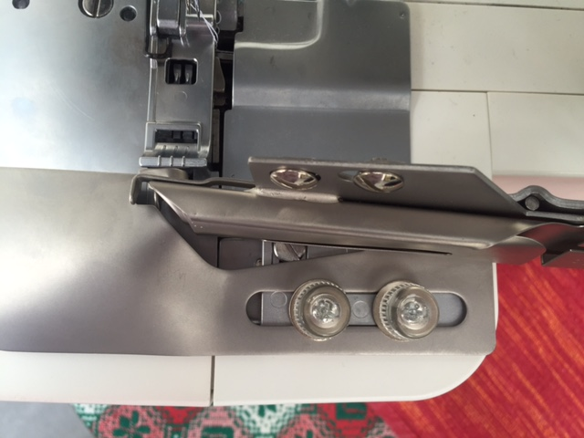Schritt 3: Jetzt wird der Bandeinfasser mit den größeren Schrauben und den Unterlegscheiben angebracht. Am besten so, dass der Nähfuß mit der Führung des Bandeinfasser schön abschliessen kann.