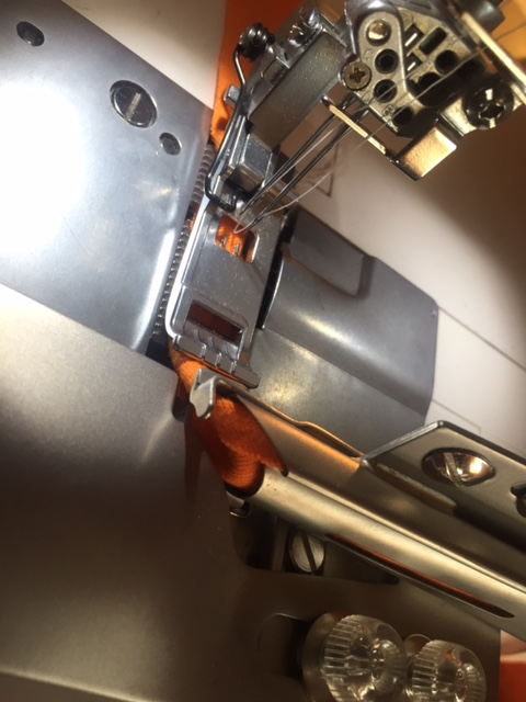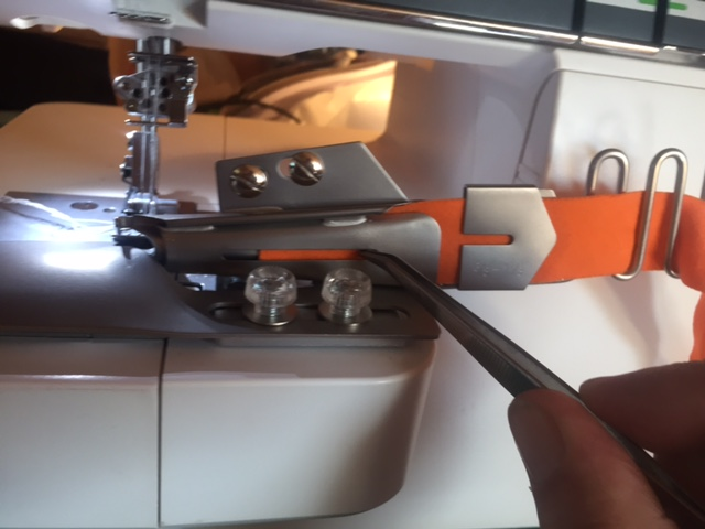 Schritt 4: Es ist Zeit, sich um das Einfassband zu kümmern. Am besten ihr schneidet 28 mm Einfassband schräg zu und fädelt es in die Führung des Coverstitch Einfassers ein. Tipp: Mit einer Pinzette geht das super gut.