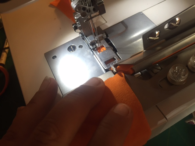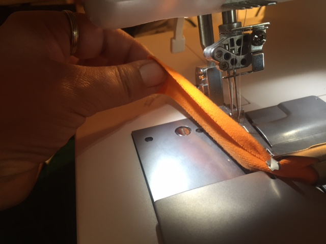 Schritt 7: Jetzt braucht ihr beide Hände, denn es kommt der einzufassende Stoff hinzu. Schaut euch gut das Bild an, denn der Stoff kommt in die bereits etwas gefaltete Einfassung, er liegt vor dem Nähfüßchen und wird langsam miteingenäht.