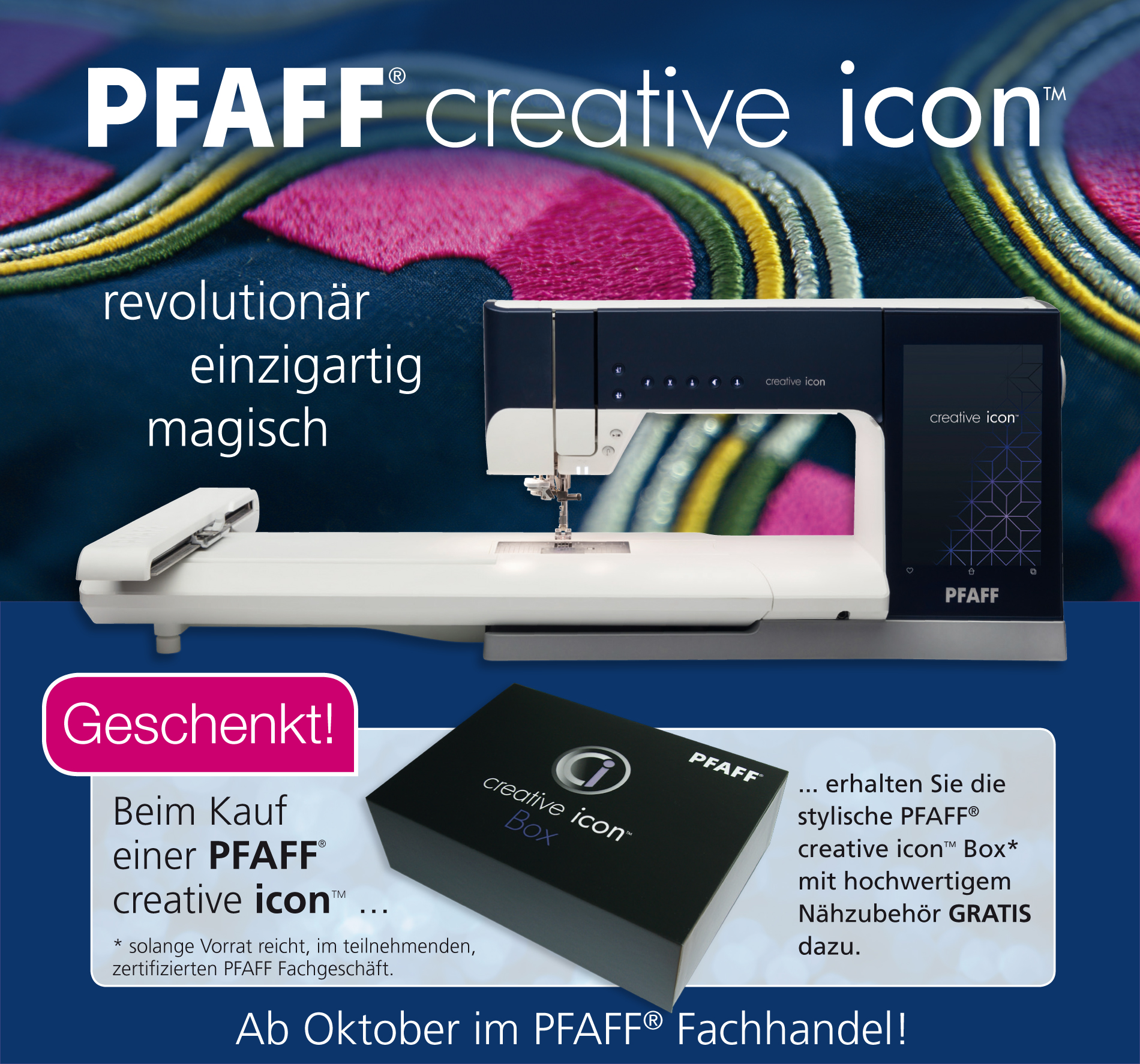 Gehört zu den ersten, die auf der Besten von PFAFF® nähen und sticken. Beim Kauf einer PFAFF® creative icon™ schenken wir euch die hochwertige PFAFF® creative icon™ Box solange der Vorrat reicht!